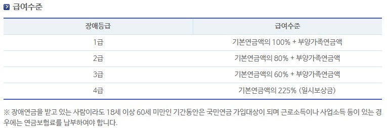 아래의 표는 장애등급에 따른 급여 수준을 나타낸 것입니다. 필요하신 분은 참고하시기 바랍니다.